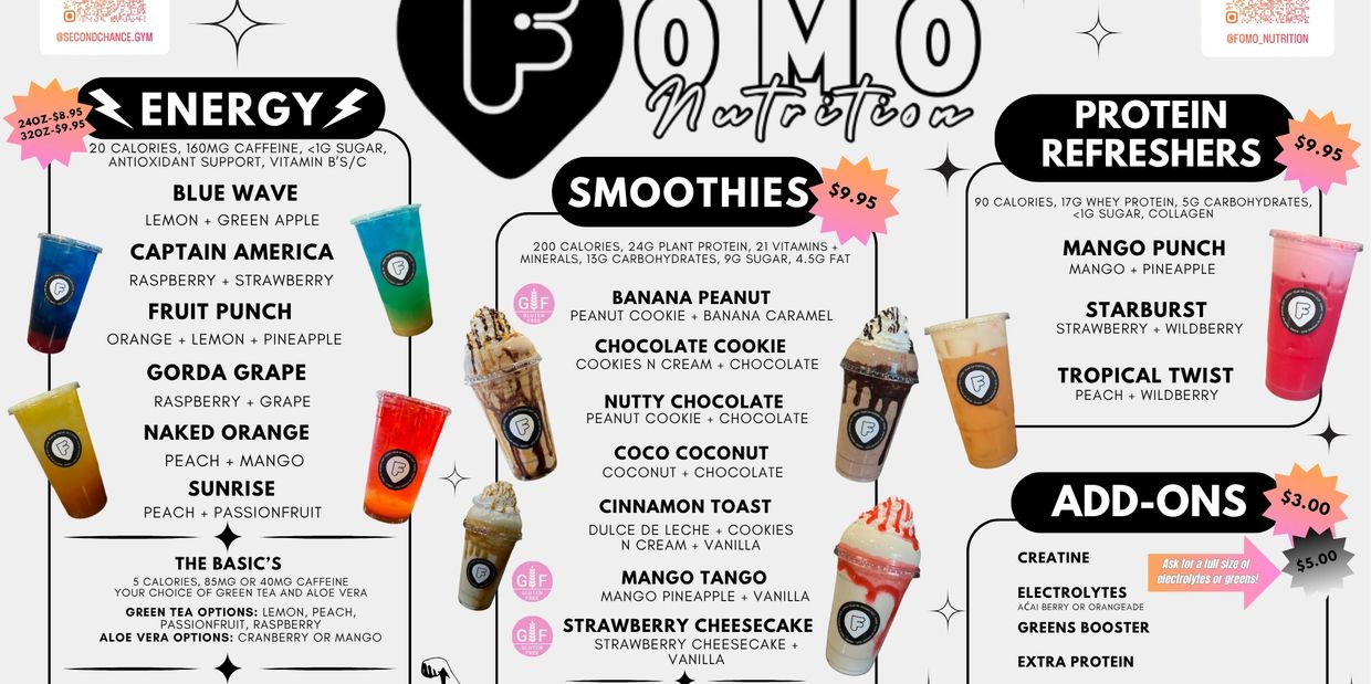 Includes meal replacement smoothies, refreshers, & post workout shakes